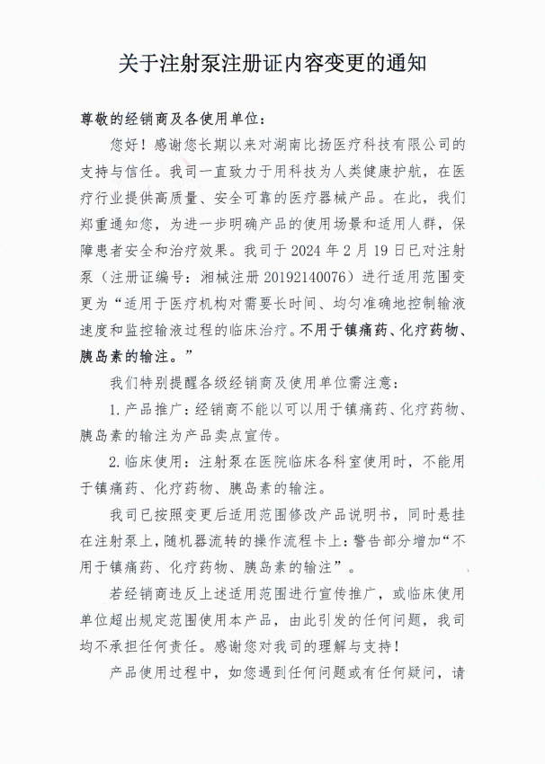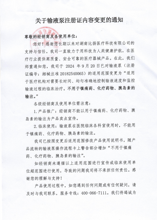 1. 输液泵:2024年9月20日完成变更(注册证编号:湘械注准20182540065),适用范围为“医疗机构用于长时间、均匀准确控制输液速度及监控输液过程的临床治疗,不用于镇痛药、化疗药物、胰岛素输注”,已同步修改使用说明书及操作流程卡警告内容。